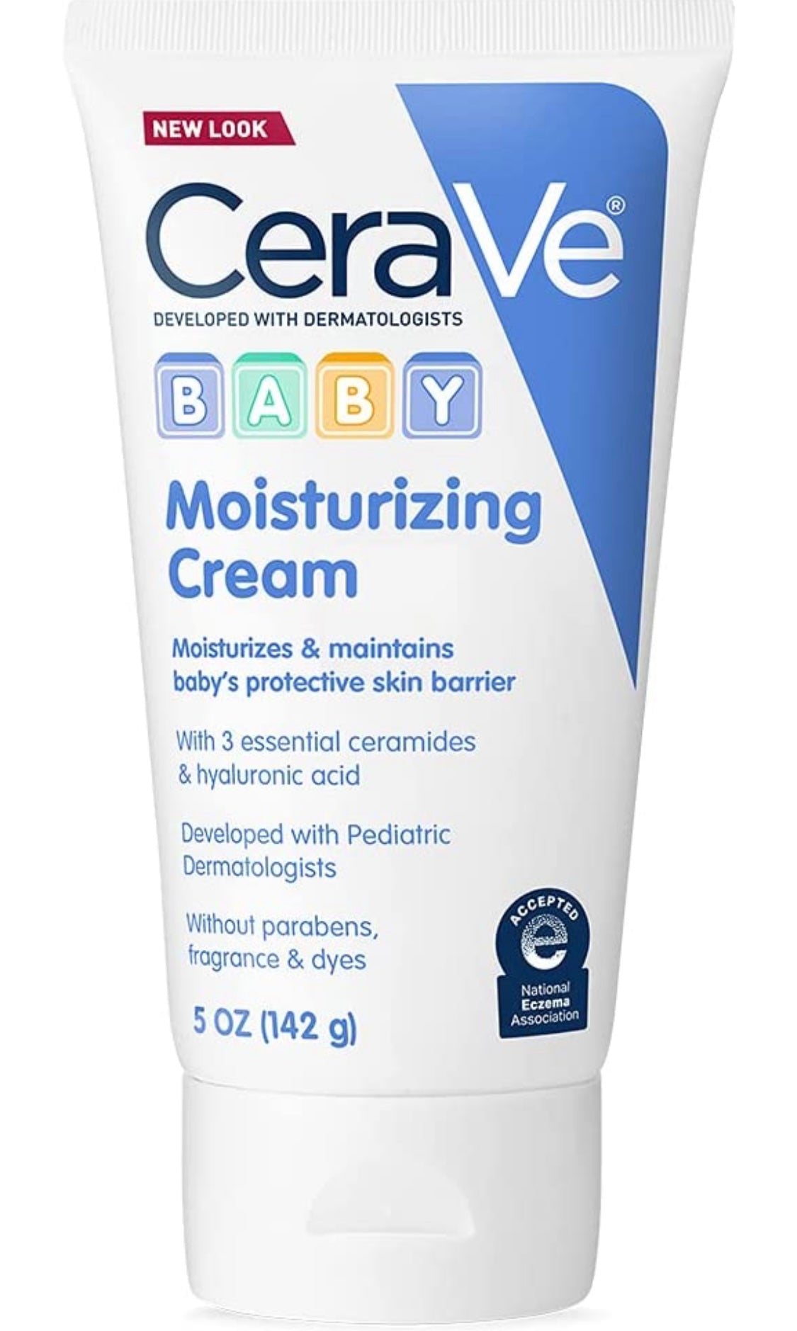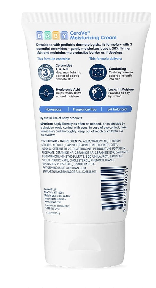 Developed with dermatologists, CeraVe Baby Moisturizing Cream is a skin protectant that moisturizes, helps protect, and maintains baby's delicate skin with 3 essential ceramides (1,3 and 6-II). Designed to deliver up to 24 hours of moisture as well as temporary protection and relief for chafed, chapped or cracked skin, this baby cream is suitable for dry, sensitive skin.